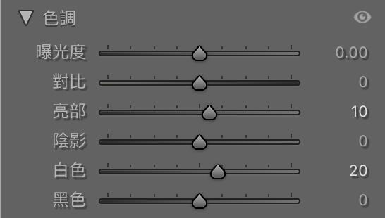 調整數值後,會發現照片整體比較「光亮」。此時要適度回頭調整「亮部」和「白色」。另外,高光位細節會流失,同樣只能憑感覺判斷該調整多少。